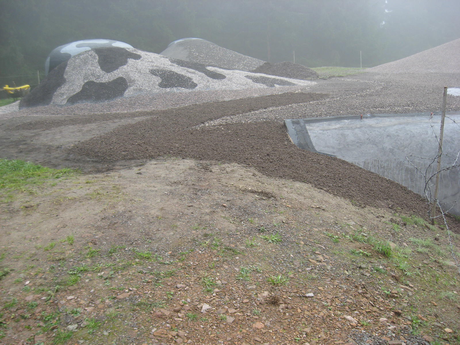 Oprava izolací a celkově i zásypu stropní desky byla opět lahůdka. Na původní vrstvu lomové prosívky nějaký "odborník" rozprostřel škváru, ovšem systémem někde trochu, jindy vrstva jak krá..! Takže nejdříve plošně pryč škvára (zhutněná téměř nepropouští vodu, je kyselá a vůbec na ní nechce růst tráva) a posléze i spodní prosívka. Následně v izolační lepence opravit různé prokopnutí a rýhy od mechanizace, celou plochu penetrovat a později opatřit nátěrem horkého asfaltu. Zpět uložit vrstvu geotextilie, položit drenážní hadici, obsypat hrubým štěrkem a vše opět dovozit a zarovnat prosívkou.